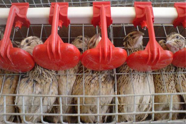 Muitas vezes, em vídeos de fazendas de codornas, você pode ver bebedores de mamilo, às vezes com um coletor de gotas. A vantagem de tais bebedouros é que a água não é desperdiçada e permanece sempre limpa. Menos custos financeiros.