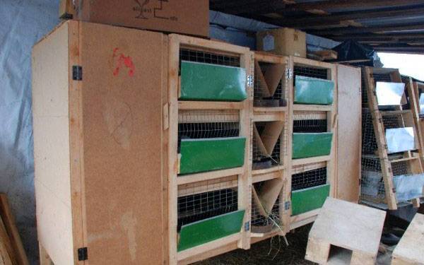 No inverno, nessas gaiolas, também obtêm filhotes de coelhos, apenas a opção com prancha não funciona. Em vez de uma cerca, um vaso-mãe de madeira é colocado.