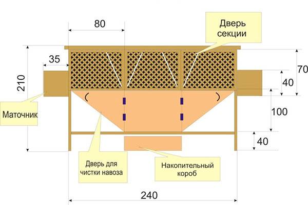 A gaiola de Zolotukhin não é menos interessante no dispositivo. Seu diferencial é a construção do piso. É feito de madeira compensada, placas ou ardósia plana de cimento-amianto. As ripas e o pallet não são usados, e a rede de 20 cm de largura é instalada no chão apenas na parede de trás da casa. O estrume é removido através dele. Para que isso aconteça automaticamente, o piso é equipado com uma ligeira inclinação.