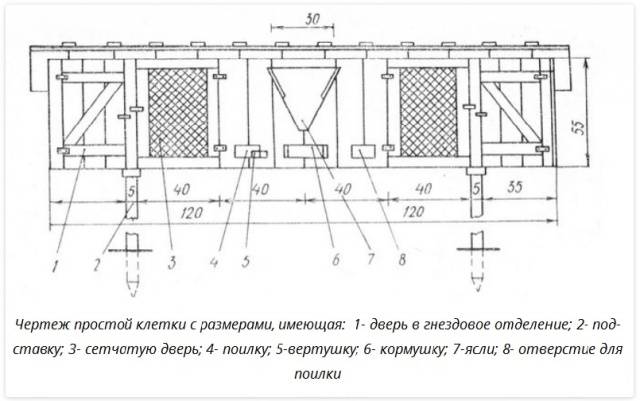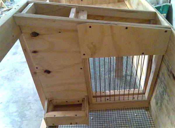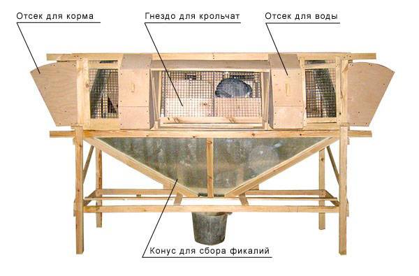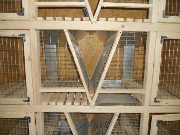 Os jovens do sexo masculino são mantidos em grupos até os três meses de idade. Se os animais são destinados ao abate, eles são simplesmente castrados. Os coelhos reprodutores são plantados em gaiolas individuais de 0,7x0,7x0,6 m. Na foto você pode ver um desenho detalhado com as dimensões de uma casa para animais jovens. Caixas de malha simples são fixadas na parede posterior.