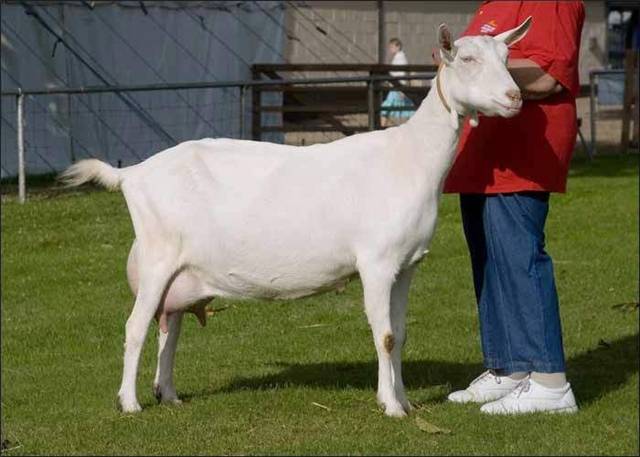 Crescimento Cabras Saanen 75-90 cm. O peso das cabras é de 55-80 kg, e o peso médio das cabras é de 110 kg. A constituição é forte. A cabeça é média e seca. As cabras podem ter ou não chifres. Testa larga. Orelhas pequenas e finas parecem um chifre. Eles podem estar se espalhando. A espinha dorsal é forte. O peito é largo e volumoso. Direto de volta. Garupa ligeiramente inclinada e bem desenvolvida. Pernas com o conjunto correto. Cascos fortes. A pelagem é espessa, sem subpêlo, o pêlo é curto, fino. A pele é fina. O úbere é bem desenvolvido e grande.