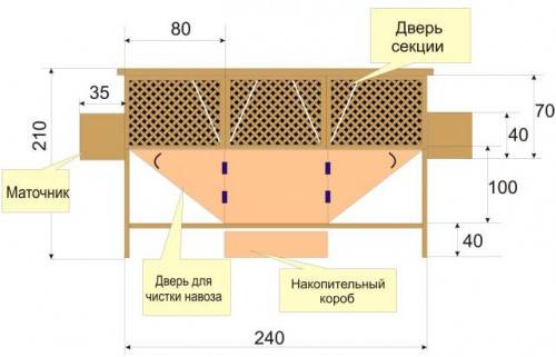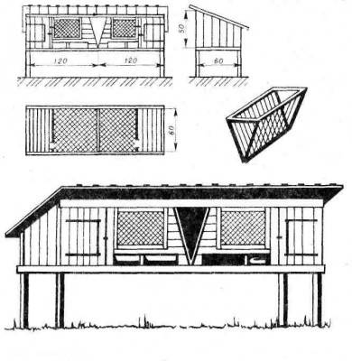 Na parte frontal existem duas portas sólidas e duas portas de malha. No último - os alimentadores são fixos. Toda a estrutura é elevada a 80 cm do solo com a ajuda de pernas.