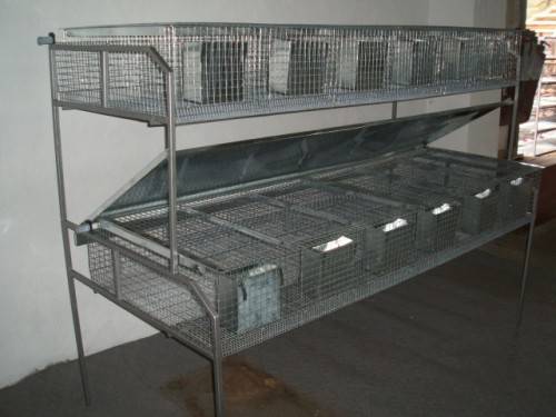 - As gaiolas duplas são usadas para abrigar dois coelhos adultos. Podem ser homens ou mulheres. O interior da caixa do coelho é dividido por uma grade ou divisória de madeira compensada. O chão foi arrancado das ripas. Durante o período de nascimento, a fêmea é colocada com uma célula-mãe com um orifício de 20x20 cm.
