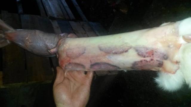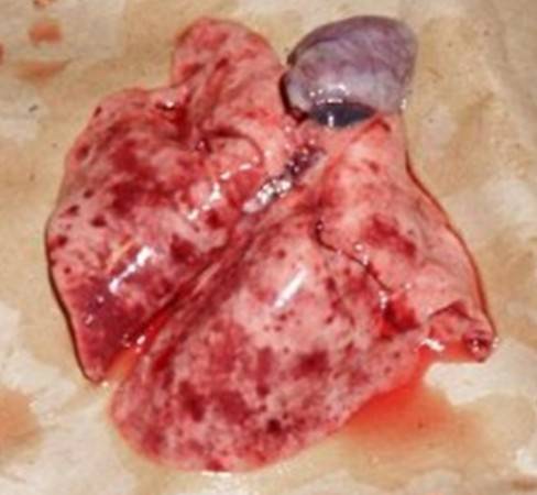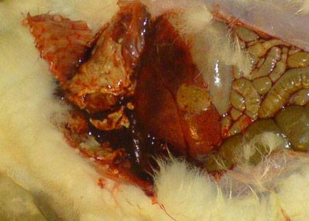 Uma autópsia mostra que a causa da morte do coelho foi edema pulmonar. Mas o vírus começa a se desenvolver no fígado, levando a mudanças irreversíveis quando o animal morre. Na verdade, após a morte de um coelho, o fígado se assemelha a um trapo podre que se quebra facilmente. O fígado é amarelo-acastanhado e dilatado.