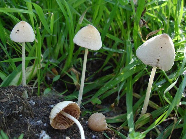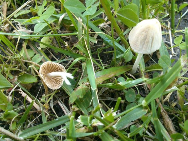- Conocybe branco leitoso também não comido. Capuz de orla irregular, esbranquiçada, com matiz amarelado. Ele difere no tamanho pequeno - até 2,5 cm. Em espécimes jovens, é fechado, em forma de ovo. Em seguida, assume a forma de um sino, nunca totalmente revelador. A perna é reta, muito fina e bastante longa, cerca de 5 cm, a polpa é macia e amarelada. Não há anel na perna. Frutificando todo o verão, encontrado na grama. A vida dos corpos frutíferos não é mais do que 2 dias.