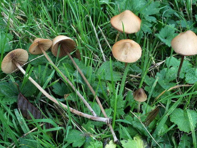 - Konocybe de cabeça grande - uma espécie não comestível de tamanho miniatura. O chapéu cônico atinge um diâmetro de 1-2 cm, de cor marrom com tonalidade avermelhada. O chapéu é canelado com placas translúcidas. Senta-se em uma perna marrom-escura. Mais frequentemente encontrado na grama, gosta de irrigação abundante. Mas a vida do corpo frutífero é curta.