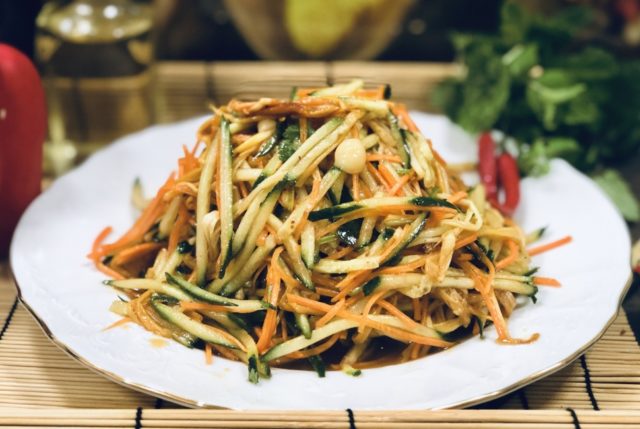 - Dobre as folhas em um recipiente, adicione os pepinos picados, o alho e a cebola.