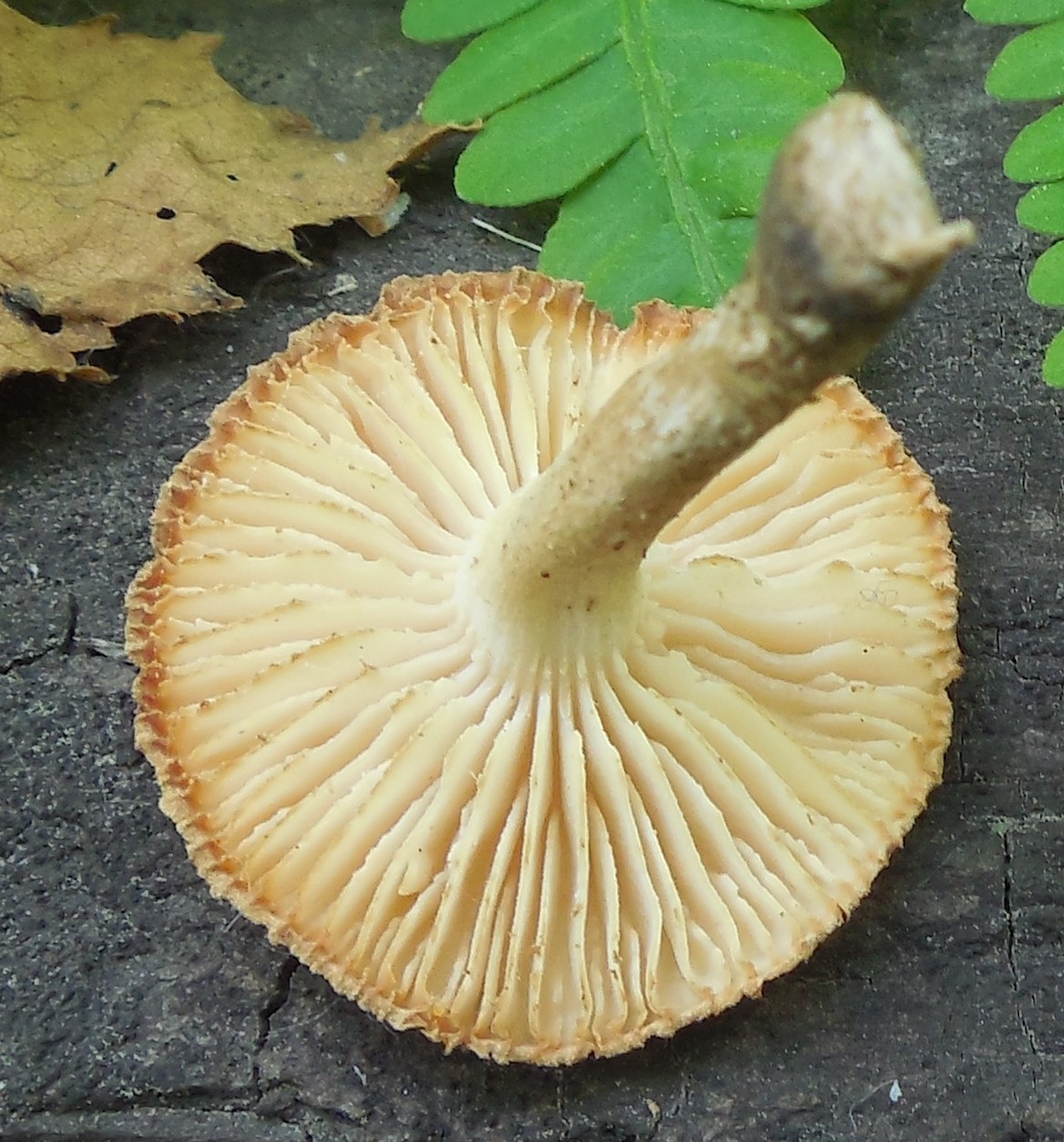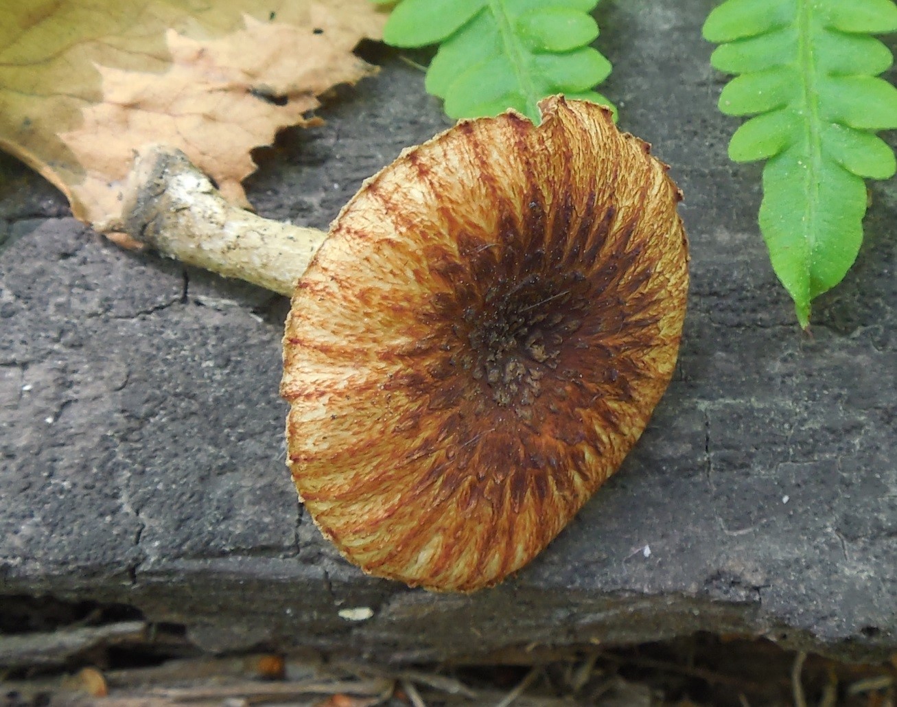 A tampa é pequena, com até 4 cm de diâmetro. Em espécimes jovens, tem uma forma convexa, à medida que cresce, endireita gradualmente, deixando uma pequena marca no centro. A superfície é coberta por uma casca marrom alaranjada ou ocre. Com a idade, as bordas ficam descoloridas e tornam-se de cor amarela clara. A pele é seca, ligeiramente áspera ao toque, coberta por um padrão escamoso.