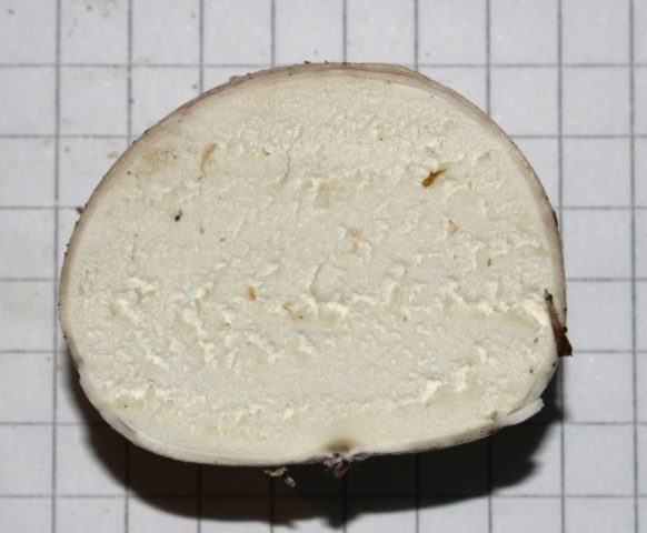 Branco primeiro (dentro e fora). Com o tempo, o clarão cinza-chumbo adquire uma tonalidade amarela. Na maturidade, a cor varia do marrom acinzentado ao marrom oliva. A polpa é branca como a neve, elástica. Em seguida, torna-se cinza ou verde-preto, à medida que se enche de esporos maduros. Pode haver mais de um milhão deles. Pisando em uma capa de chuva escura e adulta, uma nuvem de poeira aparece.