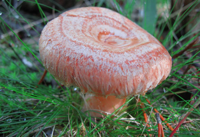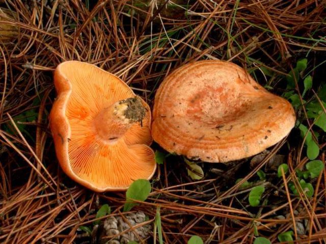 O pinho, ou verdadeira camelina, é um fungo rasteiro que se eleva em média 5 a 7 cm acima do solo. Na foto de um cogumelo do pinheiro, pode-se ver que o seu chapéu em tenra idade é plano e ligeiramente convexo, mas depois torna-se mais largo, até 15 cm de diâmetro, e assume a forma de um funil. Existem listras claras nas bordas da tampa, e as próprias bordas nos fungos jovens são levemente enroladas para dentro. A superfície inferior do chapéu é coberta com placas laranja.