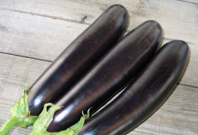 Frutos roxos escuros - alongados, em forma de gota, podem esticar até 20-26 cm.O diâmetro do engrossado, a parte inferior do fruto - até 5 cm, a parte superior - até 4 cm. a fruta chega a 200-250 g. A casca é brilhante, fina, fácil de limpar ... A polpa firme apresenta uma agradável cor branca cremosa. Nas descrições dos jardineiros que cultivaram este híbrido, nota-se o sabor suave e delicado da fruta, sem qualquer indício de amargor.