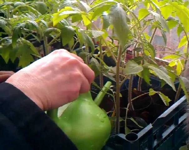 Após alimentar as mudas de tomate mergulhadas, a rega é realizada imediatamente. Eles perseguem um propósito duplo - eles lavam os resíduos de fertilizantes das folhas e caules da planta e ajudam os componentes líquidos a serem absorvidos mais rapidamente.
