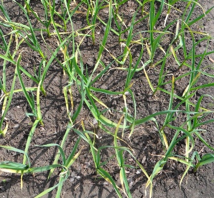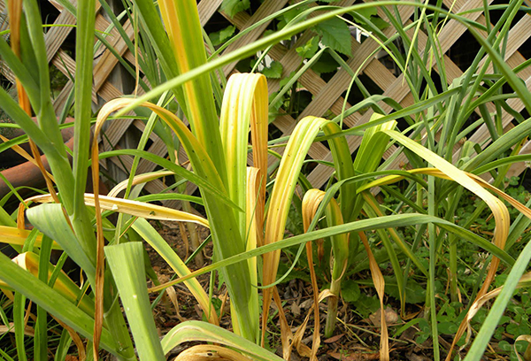 Quando maduros, os topos ficam amarelos na parte inferior. Se as folhas começarem a amarelar nas pontas, o alho carece de potássio e nitrogênio. Isso geralmente ocorre nas regiões do sul.