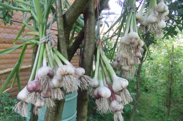 Os topos não são cortados durante a colheita. As raízes das plantas escavadas são cortadas em breve. O alho é amarrado em cachos pelas pontas e pendurado à sombra no ar para secar. Depois de secas as cabeças, as pontas podem ser cortadas e o alho guardado em local fresco.