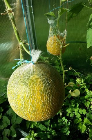 Os melões que amadurecem podem quebrar chicotes, razão pela qual muitos produtores usam o método de rede. Na foto, você pode considerar esse método mais de perto. Certifique-se de amarrar os sacos de rede às vigas transversais da estufa. Isso protegerá o caule do melão contra danos.