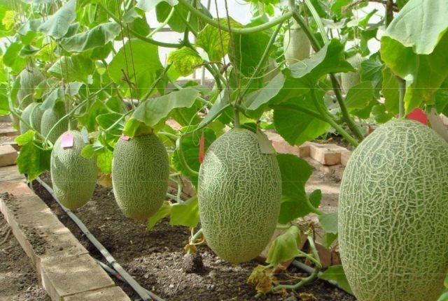 Em condições de estufa ou para economizar espaço no local, os melões são formados verticalmente:
