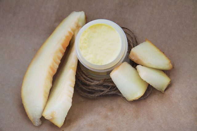 Uma mistura de melão e azeite de oliva nutre e hidrata perfeitamente a pele cansada do rosto e das mãos por muito tempo. Tome 1 colher de sopa. eu. óleo por 4 colheres de sopa. eu. polpa, misture e aplique como uma máscara. Após o procedimento, a pele fica aveludada, lisa e esticada.