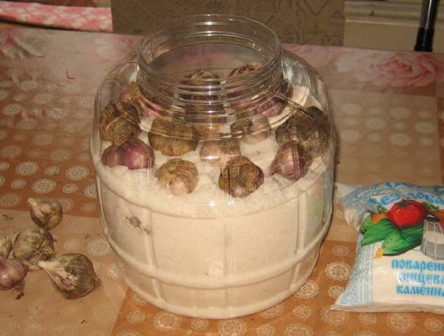 - Outro ingrediente que evita que o alho de inverno se estrague no inverno é sal de mesaOs componentes são colocados em uma jarra em camadas, alternando alho e sal.