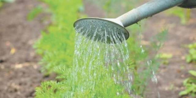 - Após a germinação das sementes, a rega deve ocorrer com frequência suficiente, 2 vezes por semana, com água morna de um regador. O consumo de água é de até 5 litros por 1 sq. m desembarques. As plantas mais velhas requerem menos umidade. Durante o período de formação das raízes, a irrigação pode ser reduzida para 1 vez por semana, mas ao mesmo tempo o consumo de água pode ser aumentado (10 litros de água por 1 m2 de plantio). A rega abundante é a chave para obter cenouras grandes e suculentas. Na falta de rega, os frutos são amargos e duros. Organize a rega com base nas condições meteorológicas. Antes da colheita, 2 semanas antes, é recomendável interromper a rega;