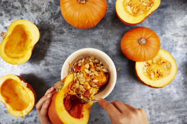 Depois de lavar a abóbora, limpe com papel toalha, corte ao meio e retire todas as fibras com sementes, colocando-as em um prato. Em seguida, as sementes são separadas das fibras manualmente, transferidas para uma peneira e lavadas em água corrente.