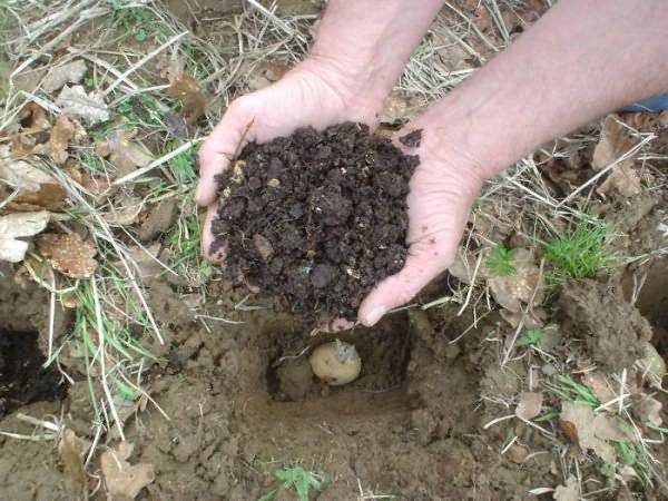 As raízes da planta estão localizadas acima do tubérculo. Se você colocar comida no fundo do buraco, será difícil para o cultivo de batatas usá-la.
