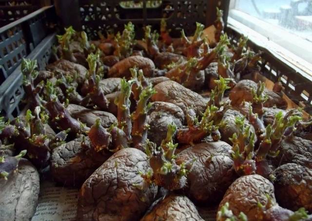 A germinação dos tubérculos antes do plantio tem um efeito muito bom no rendimento geral da batata. Os vegetais de raiz Laptya são germinados em um quarto escuro e bem ventilado com uma temperatura de 13-15 graus. Levará de 20 a 25 dias para aparecerem bons brotos.