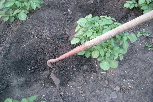 Ao amontoar o arbusto de batata Rosalind, o solo úmido é escavado até as raízes. Este procedimento permitirá obter o máximo rendimento, pois favorece a formação de novos tubérculos. Um efeito adicional é proporcionado pelo afrouxamento do solo ao redor das plantas, no qual a terra fica saturada de ar e seca mais lentamente. É a primeira vez que as batatas da variedade Rosalind são batidas após o surgimento dos rebentos. Durante a temporada, os arbustos são geralmente amontoados duas vezes com um intervalo de três a três semanas e meia.