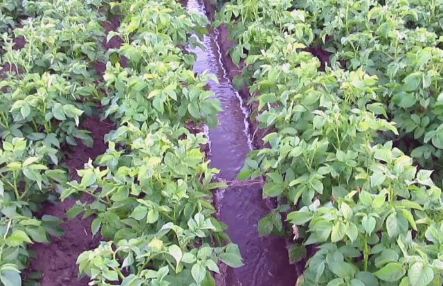Regar batatas da variedade Lilás neblina enquanto o solo seca com água aquecida. Em clima quente, é realizada 1 rega por semana, em clima moderado - 1 vez em 2 semanas. Pare de regar algumas semanas antes da colheita.