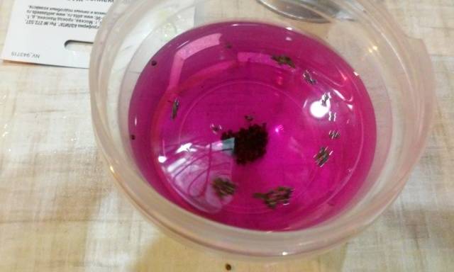 Agora é a vez da segunda etapa - desinfecção... Para isso, as sementes do saco são mergulhadas em uma solução forte de manganês (1%). É impossível mantê-los por muito tempo, 20-30 minutos são suficientes. Depois disso, as sementes são bem lavadas com água corrente.