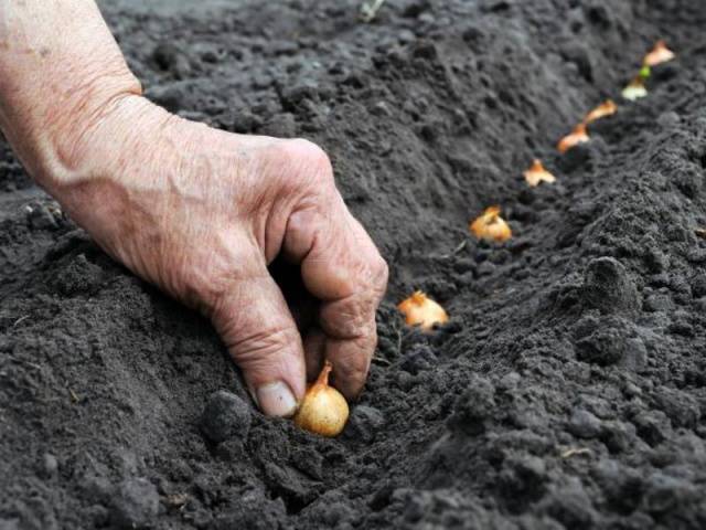 Uma ranhura é feita no canteiro do jardim, derramada com água se o solo tiver tempo de secar, e as cebolas começam a ser plantadas. Esquema de plantio: 10 cm entre os bolbos, 20 cm entre as filas Os bolbos são colocados nos sulcos até 2 cm de profundidade, afogando-os apenas ligeiramente. Em seguida, role o solo.
