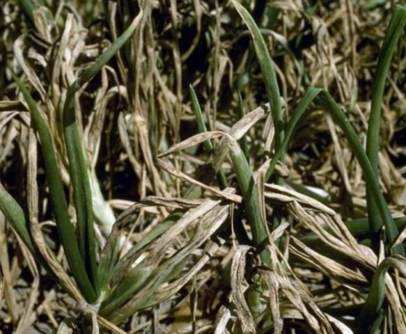 A doença pode ser determinada pela formação de placa cinza na folhagem. Sem tratamento, toda a pena é afetada e a planta morre. A doença se espalha rapidamente para plantas saudáveis, resultando em rendimentos mais baixos, baixa qualidade do bulbo e vida útil mais curta.