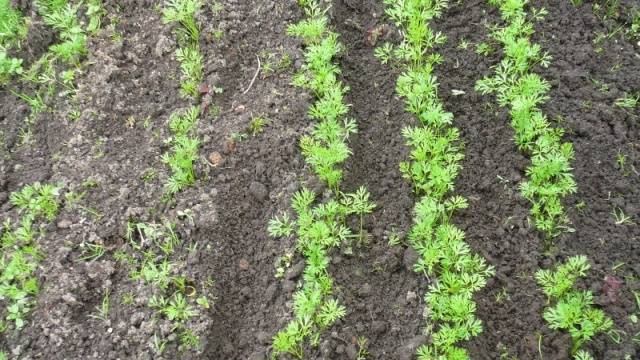 As fiadas de cenouras que surgiram na crista são marcadas, rega-se regularmente, afrou-se o espaçamento das filas e as plantas são desbastadas em várias etapas. O primeiro desbaste é feito até que as folhas emparelhadas atinjam a altura de 1 cm. As plantas fracas com atraso de crescimento são removidas.