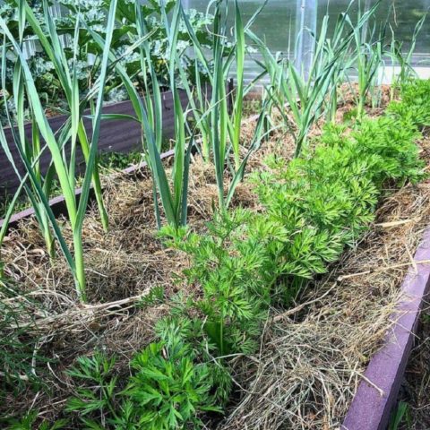 Na primavera, quando toda a neve derrete e o alho começa a subir, a cama é coberta com papel alumínio. Em maio é retirado, antes dessa época as cenouras já deveriam ter brotado. Para evitar que o alho afogue seu crescimento, suas folhas devem ser podadas. Além de aumentar a iluminação, esse procedimento também promove a liberação de óleos essenciais, que servem apenas para proteger as raízes da cultura.