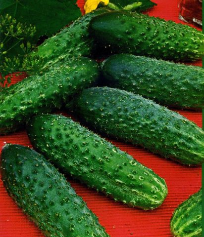 Uma variedade de pepinos de frutos pequenos Abundante forma verdes de uma forma uniforme, o volume da primeira e da última colheita é o mesmo.