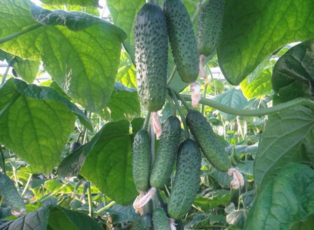 - Os frutos são de cor verde escura, de formato cilíndrico, pesando de 100 a 130 gramas. O tamanho médio de um pepino é de 8 a 10 cm. Esta variedade tem uma característica tal que ideal para colher pickles (frutas 3-5 cm de comprimento, colhidas 2-3 dias após a formação dos ovários) e pepinos (frutos 5-8 cm, colhidos 4-5 dias após a formação dos ovários).