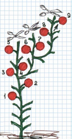 Para tomates determinantes, além do esquema proposto para a formação de plantas em dois e três caules, pode ser utilizado um esquema de pinçamento gradual. Assim, um enteado é deixado sob a primeira escova de frutificação de uma planta baixa ou média. Este rebento lateral desenvolve-se com segurança e também forma cachos de frutificação. Também é necessário deixar um enteado sob o primeiro. Após seu crescimento, o procedimento de pinçamento gradual é repetido. Isso permite que tomates menores e médios se formem em um caule, enquanto os novos enteados darão frutos constantemente, substituindo o caule principal que parou de crescer. Esse beliscão de tomates pode ser visto no diagrama abaixo.