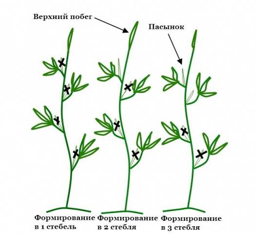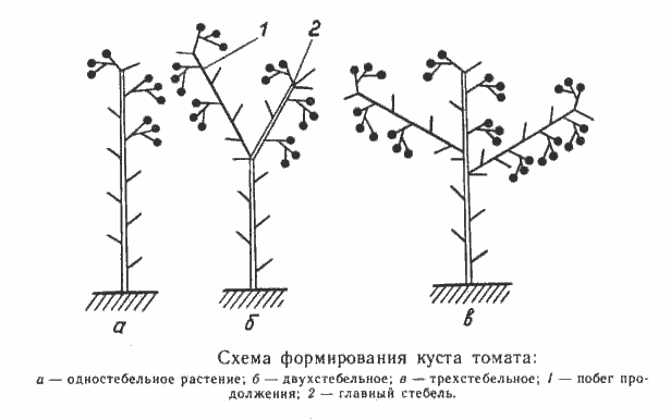 Quando formação de arbusto todos os enteados formados são removidos em uma haste.Essa pinça de tomate é realizada para variedades altas indeterminadas. Se estamos falando de beliscar tomates de um tipo semideterminante, então, no processo de remoção dos brotos, é necessário deixar um dos enteados mais fortes. Isso permitirá que a planta forme cachos de frutos no enteado no momento em que o crescimento do caule principal já foi interrompido. Quando beliscar tomates com tipo determinante arbusto deixa dois, e às vezes mais rebentos laterais. O esquema para apertar tomates em um, dois ou mais caules é mostrado abaixo.
