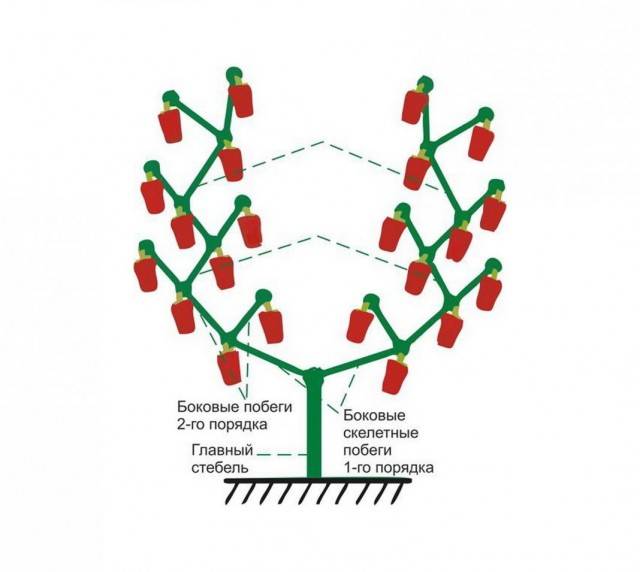 Os primeiros ramos que crescem a partir da ramificação são chamados de esqueletos, ou brotos de primeira ordem - eles formarão o esqueleto principal do arbusto de pimenta no futuro. Eles, por sua vez, também começarão a se ramificar. Cada vez no processo de formação de dois novos brotos, apenas um deles sobra para o crescimento - o mais forte. O outro é removido com cuidado, deixando a folha e o ovário abaixo.