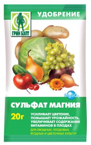 O sulfato de magnésio ajudará a preencher a deficiência deste elemento. 40 g da substância são diluídos em 10 litros de água, depois são aplicados por baixo da raiz das plantas. Para borrifar tomates, a taxa especificada é reduzida à metade.