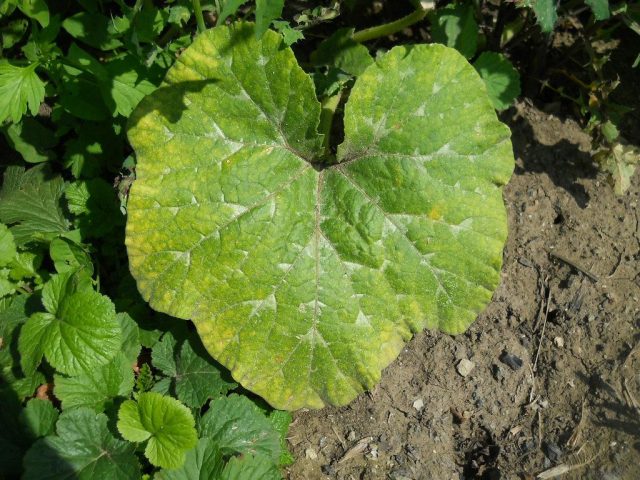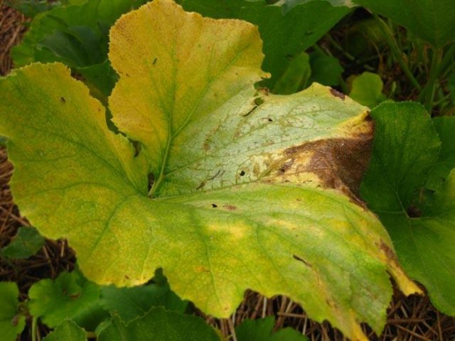 O tempo quente e ensolarado pode causar amarelecimento. As placas de folhas ficam amarelas e começam a secar se houver queimaduras. A luz solar direta, principalmente nas folhas úmidas, e a evaporação intensa da umidade no sol quente - tudo isso faz com que toda a superfície da folha fique amarela, e não apenas suas bordas. Se o tempo quente com um sol escaldante se estabelecer na região, é melhor sombrear as abóboras. Este método protegerá a planta de queimaduras.