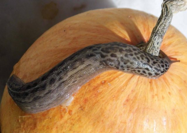 - Lesmas... As pragas aparecem na abóbora em tempo nublado e chuvoso. Eles começam a comer partes da planta, com o que as restantes ficam amarelas e murcham. Lesmas são fáceis de detectar em uma inspeção de perto, mas difíceis de lidar.