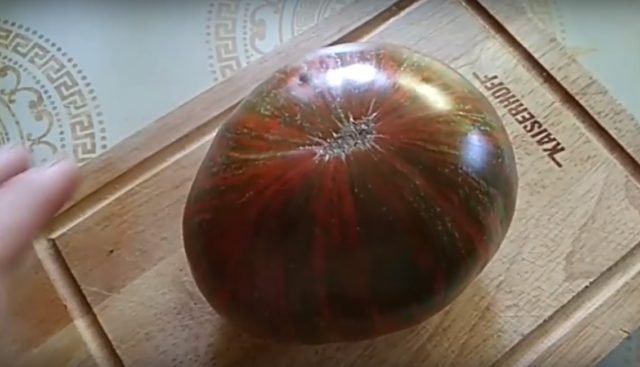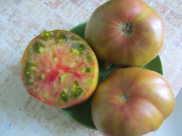 A variedade é interessante pela cor do tomate, é difícil encontrar frutos da mesma cor no mesmo arbusto. Eles podem ser marrons com manchas rosa e verdes, marrons com listras amarelas ou carmesim.