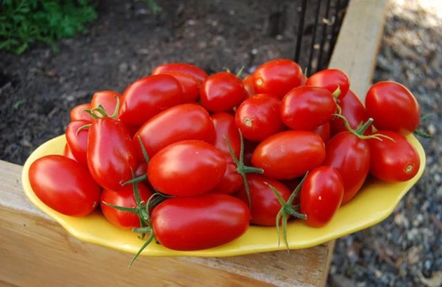 Os tomates em cascata são pequenos. Todos eles têm a mesma forma. Os frutos do primeiro cacho não diferem em tamanho dos últimos tomates: