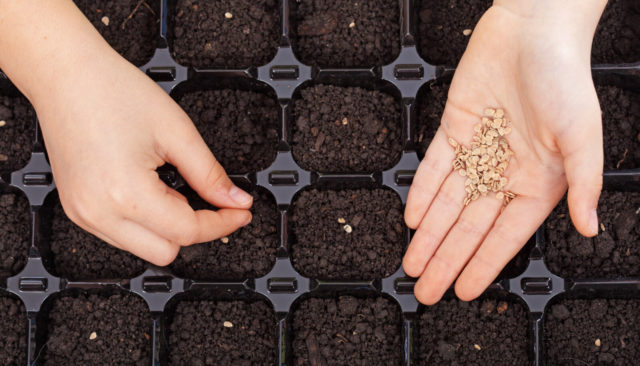 - Os recipientes de mudas são preenchidos com um substrato fértil de turfa e composto.