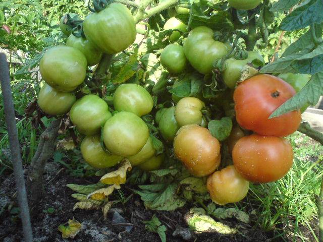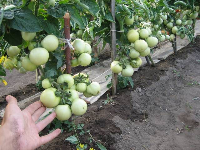 - A cor da fruta no estado verde é verde com uma mancha pronunciada na base. No processo de maturação, a mancha desaparece e os tomates adquirem uma cor vermelha brilhante.