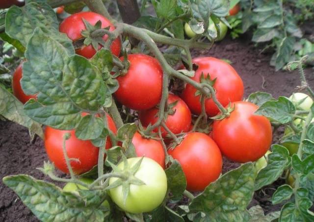Por outro lado, os arbustos deste tomate são muito baixos e compactos, atingindo apenas 25-40 cm de altura. Portanto, eles só podem ser amarrados uma vez no meio do mato, o que será suficiente para sustentar os frutos e uma aparência espetacular.