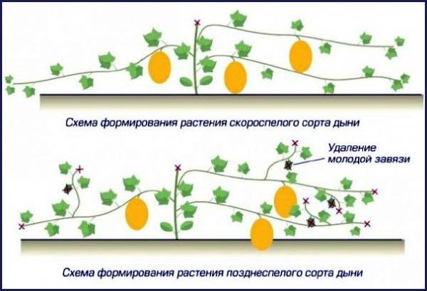 Começam a formar um melão em estufa após a formação da quarta folha com dois rebentos laterais. Para todo o ciclo vegetativo, são criadas as condições que incluem: rega moderada, cobertura, retirada de enteados, jarreteira de frutos e talos para o suporte. Ao instalar lâmpadas, eles aumentam o tempo das horas de luz do dia, monitoram a umidade do ar.