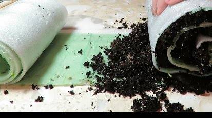 - O papel higiênico é colocado ao longo do comprimento da tira. Uma camada de papel é espalhada 1,5 cm abaixo da borda superior do suporte. As sementes são semeadas a esta profundidade para germinação. O papel é borrifado com água.