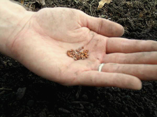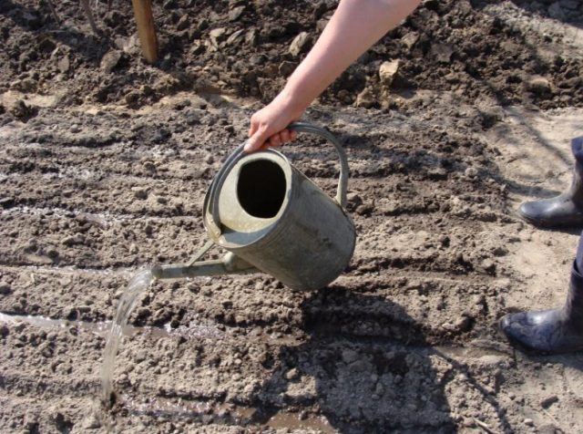 São plantadas 2-3 sementes em cada buraco, e se houver dúvida sobre a sua germinação - 3-4. O solo seco é derramado por cima com uma camada de 1,5-2 cm. Não é necessária rega adicional.