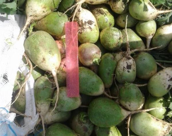 Como você pode ver na foto, a polpa do rabanete Margelan é branca. Tem um sabor suculento, adocicado, com um leve amargor. Uma cultura de raiz pesa 250-300 g, o rendimento médio é 3-3,3 kg por sq. m.